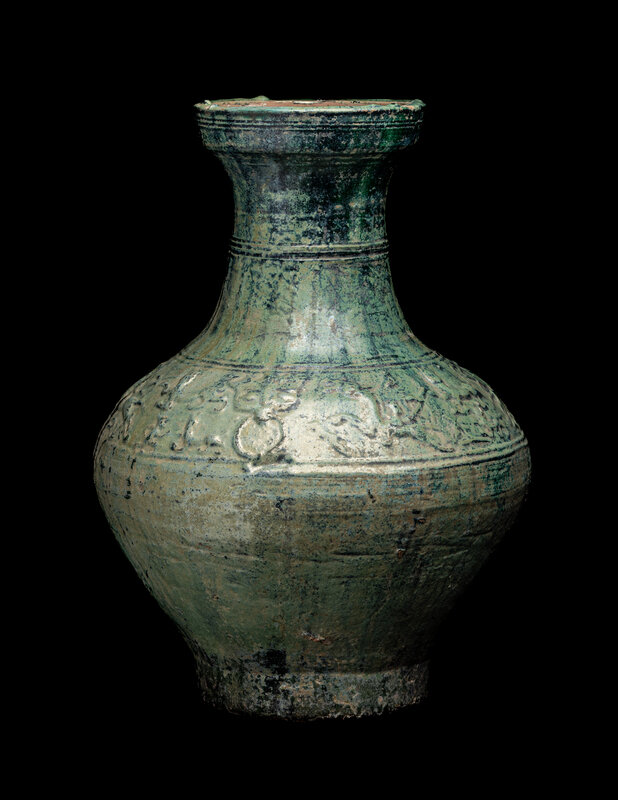 A Chinese Molded Green Glazed Pottery Hu Vase