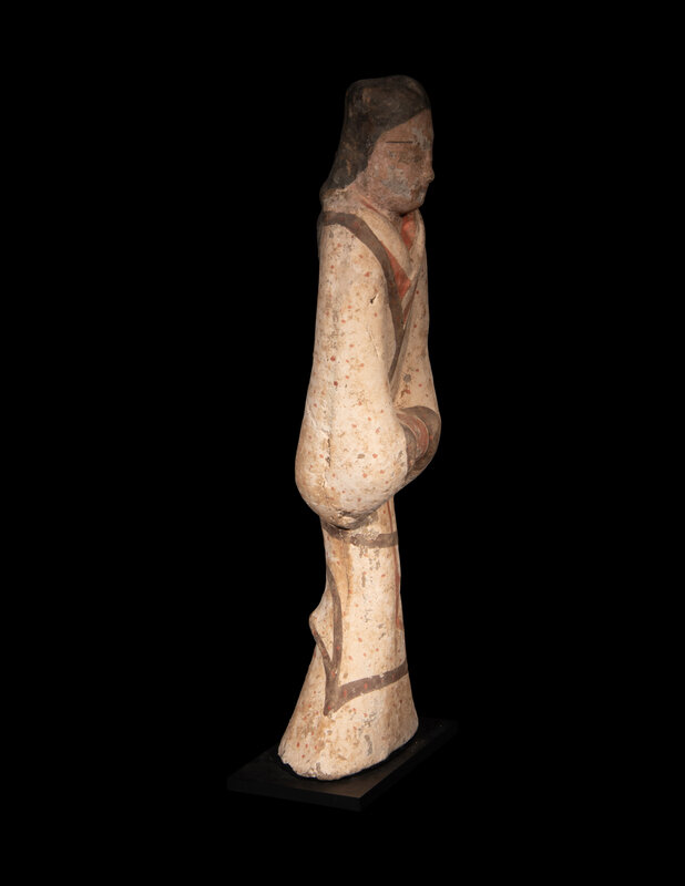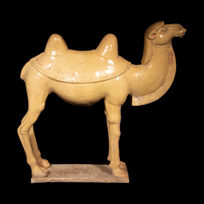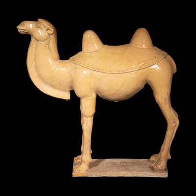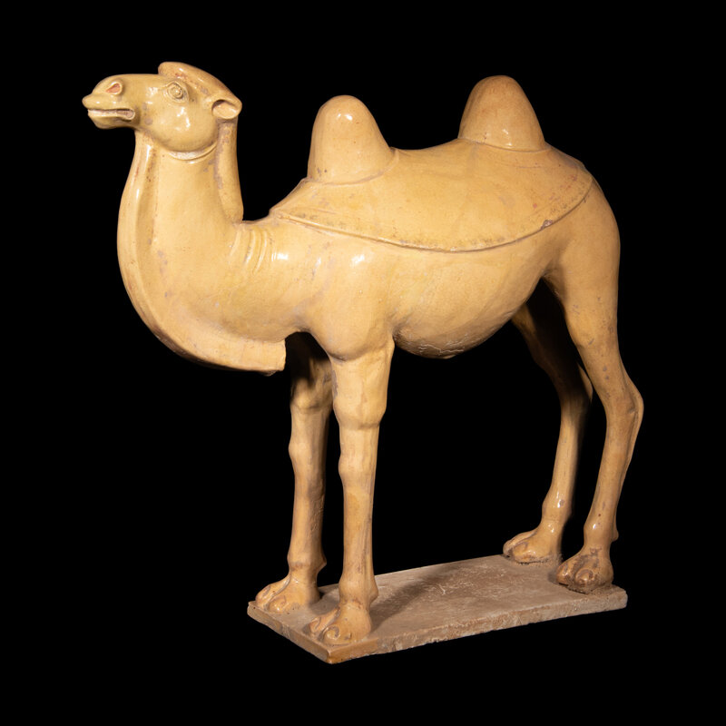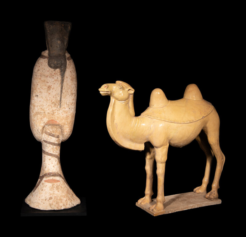 comprising two Han Dynasty figures of female attendants, and a Tang Dynasty style green glazed pottery figure of a camel.