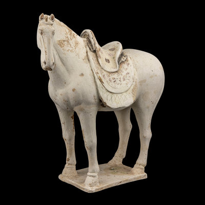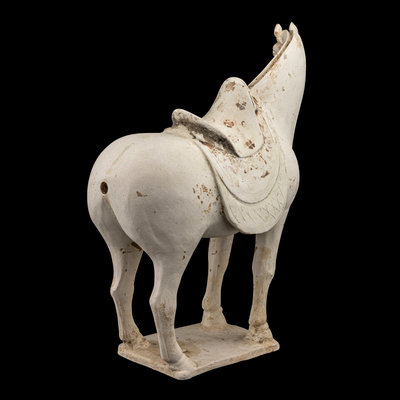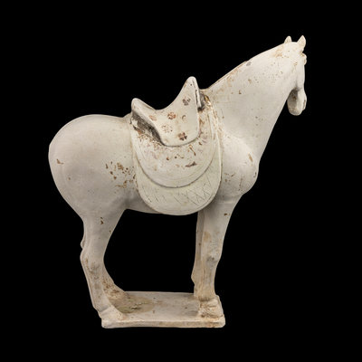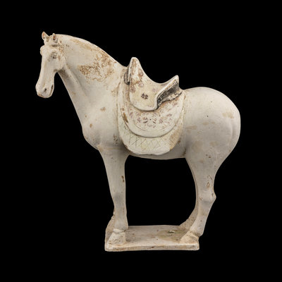 the handsome horse figure depicted standing foursquare, the head tilted slightly to the left with the mouth open, carrying a saddle on its back.