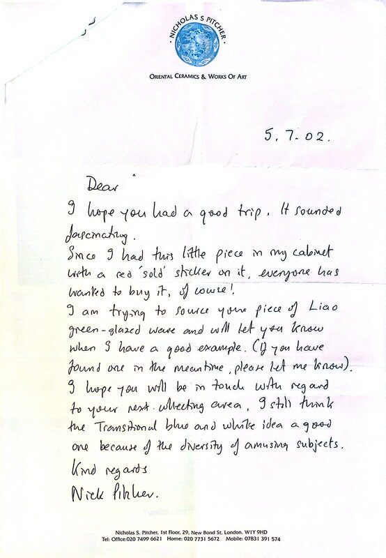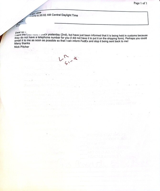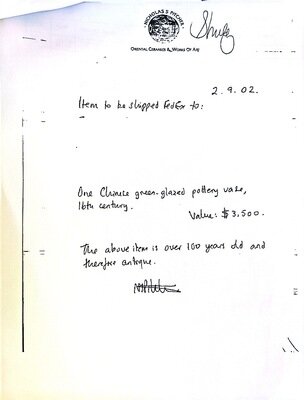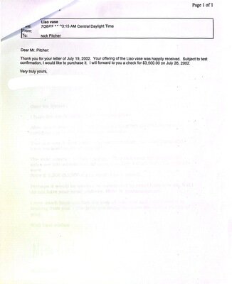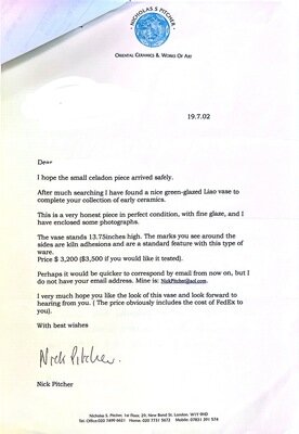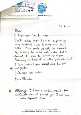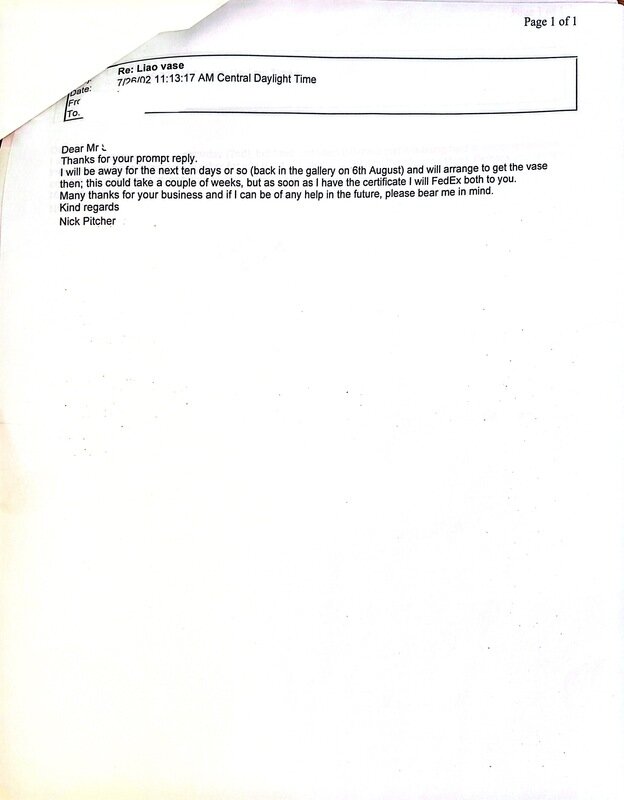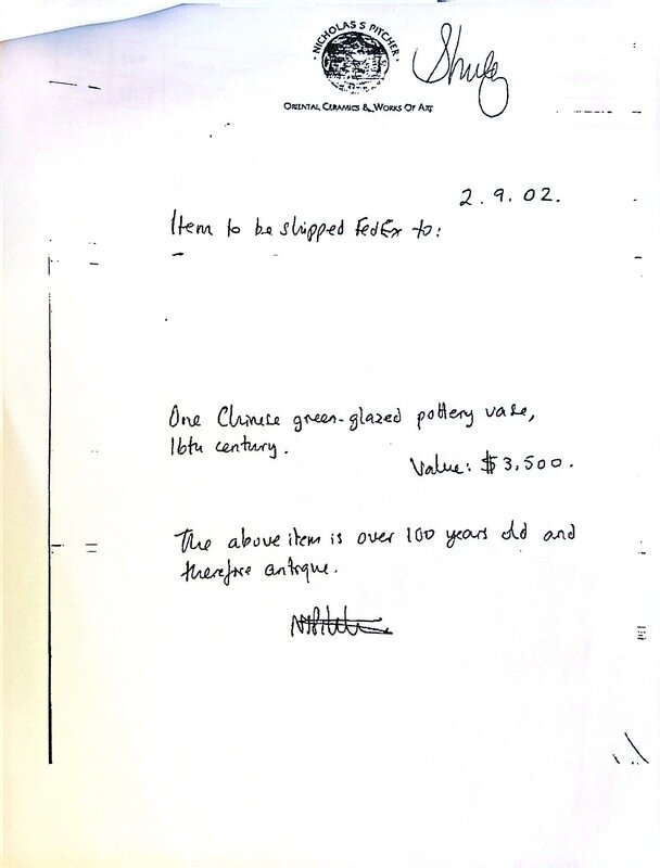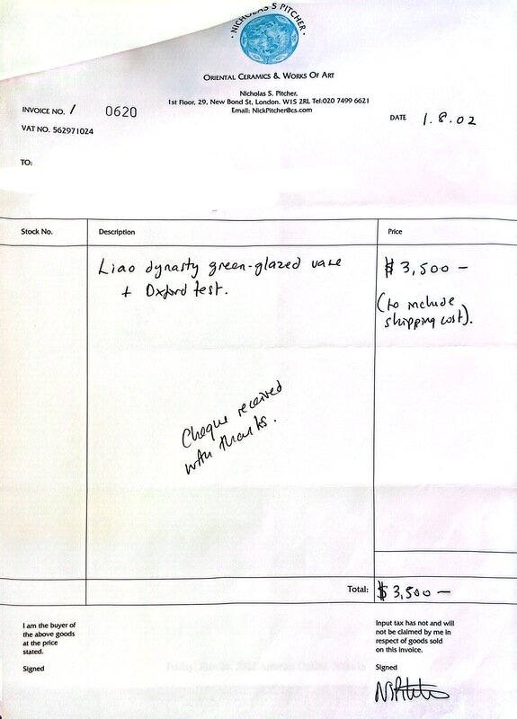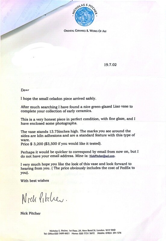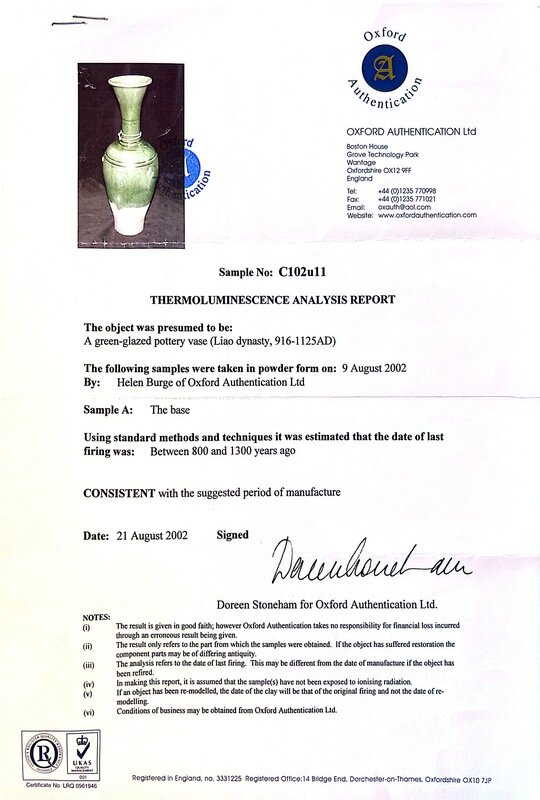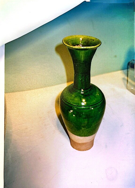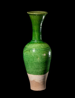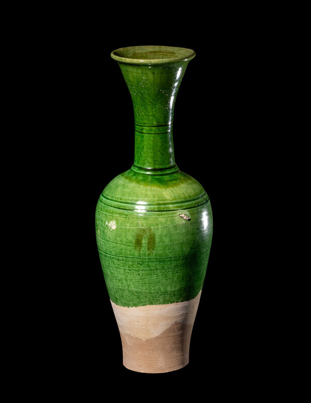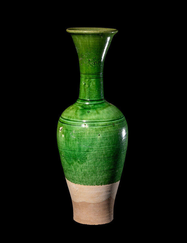 the ovoid body rising from a slightly spreading foot to an elongate neck and a flared mouth, decorated with three pairs of concentric rings, covered in lustrous green glaze stopping at the lower body.