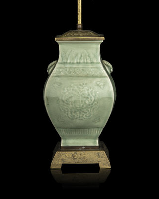 each side of the vase carved and molded with a central 'dragon' medallion surrounded by four butterflies, between a band of ruyi heads and two rows of overlapping leaves, the recessed neck applied with a pair of bat-form handles, mounted as a lamp.