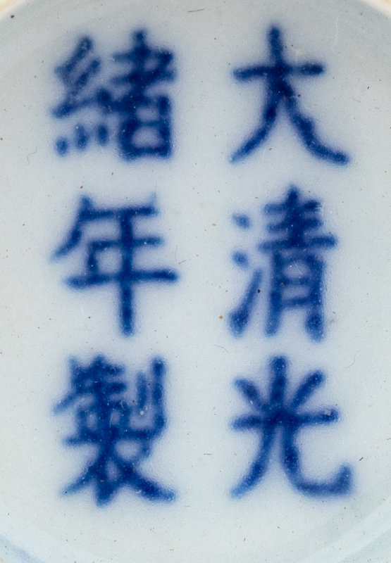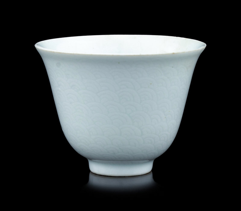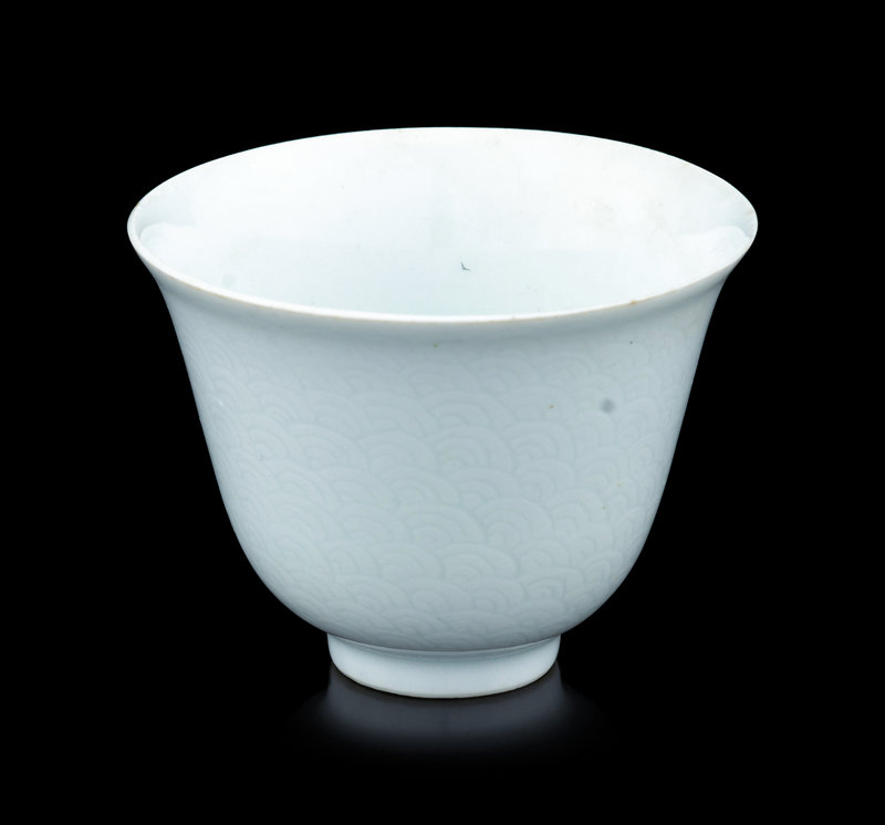 having delicately potted thin walls rising to a flaring rim, the overall exterior incised with a repeating pattern of cresting waves, the recessed base encircling the six-character Guangxu mark in underglaze blue.