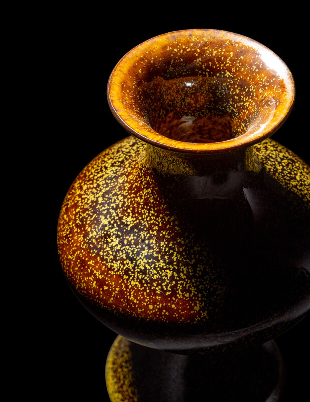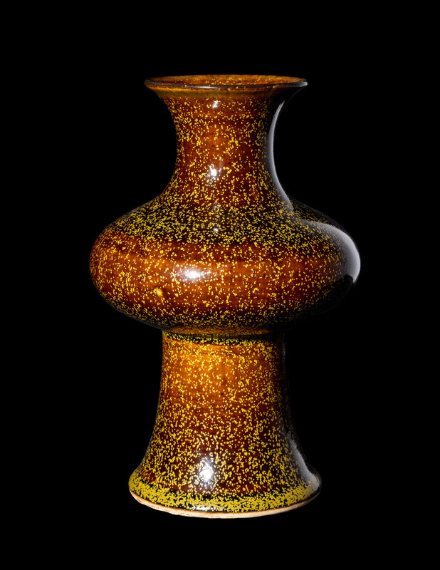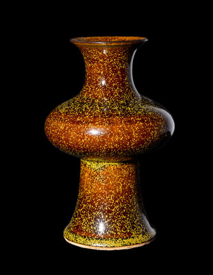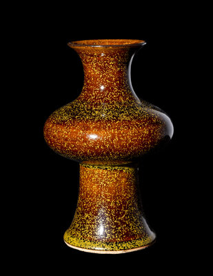 the compressed body rising from a tall, spreading foot to a slightly waisted neck and an everted mouth rim, covered overall in a lustrous dark russet glaze with light speckles.