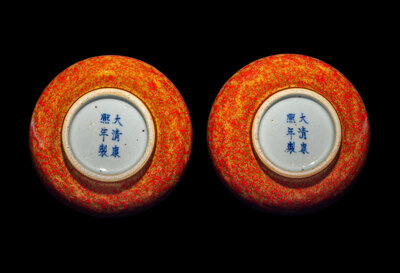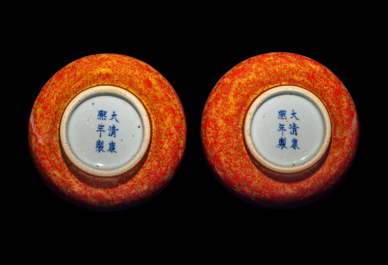 each having a low globular body raised above a beaded foot ring, coated to the exterior in a vibrant glaze.