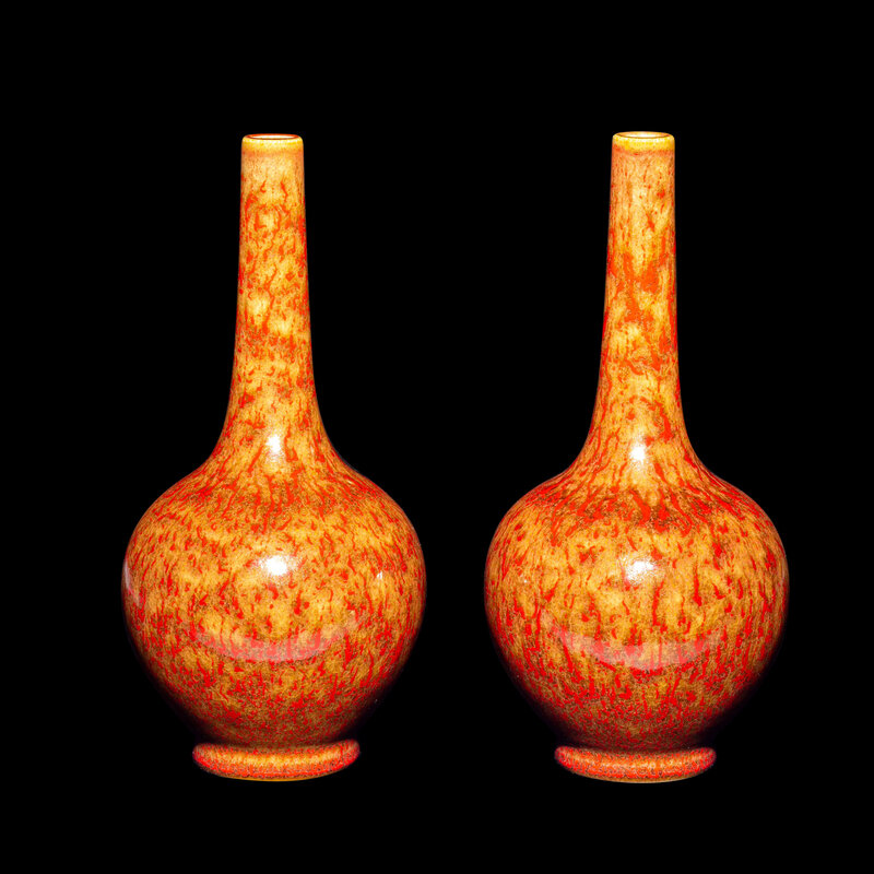 A Pair of Chinese Peachbloom Glazed Porcelain Bottle Vases