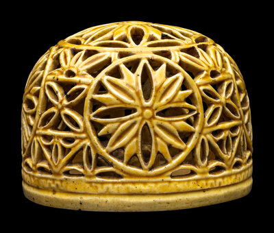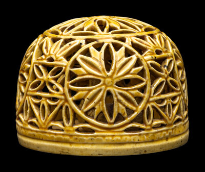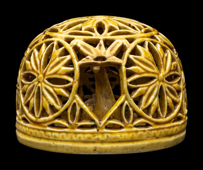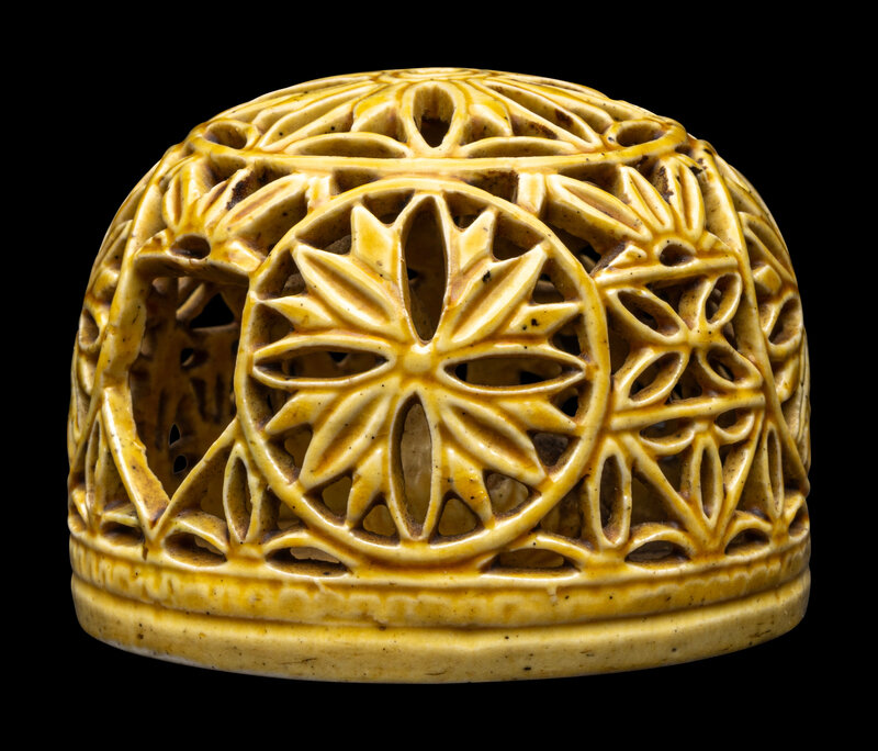 of hemisphere shape, reticulated and covered with a thick mustard yellow glaze.