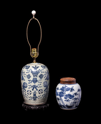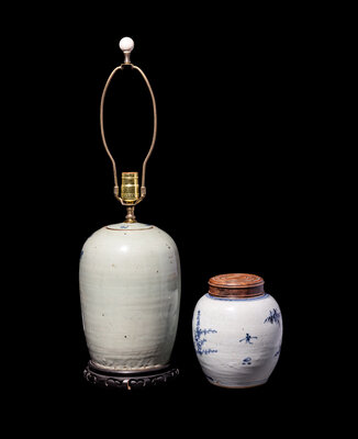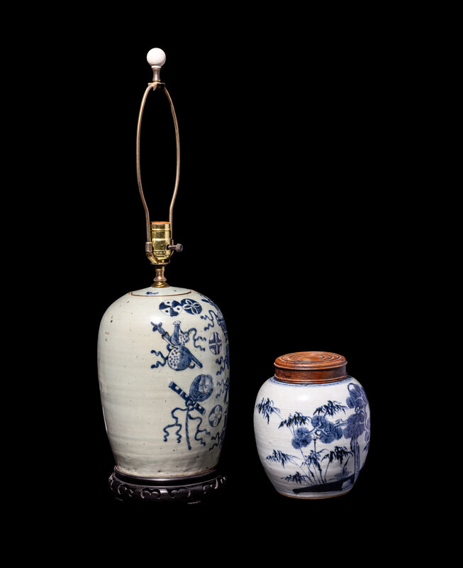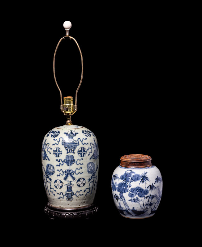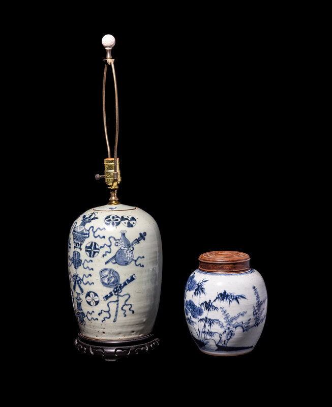 the larger example decorated with auspicious objects against a pale celadon ground, converted into a lamp; the smaller example painted with a landscape scene.