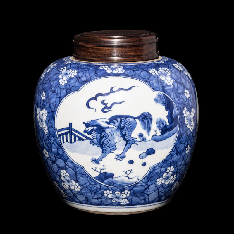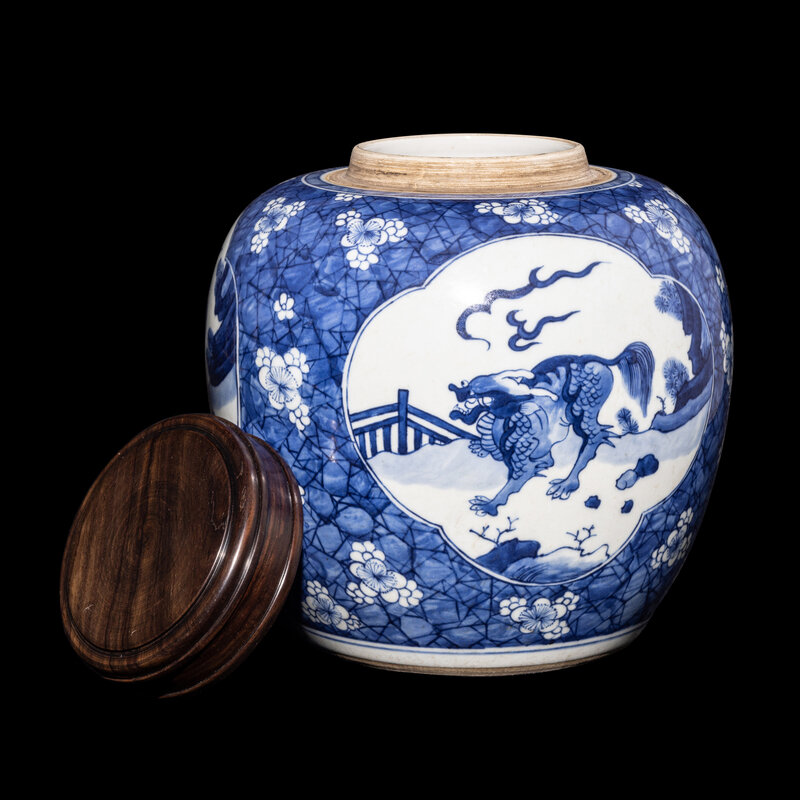 the globular jar painted to the exterior with shaped panels enclosing mythical beasts in gardens, all set above a crackled ice and prunus ground, the underside bearing a double-ring underglazed blue mark, together with a hardwood cover.