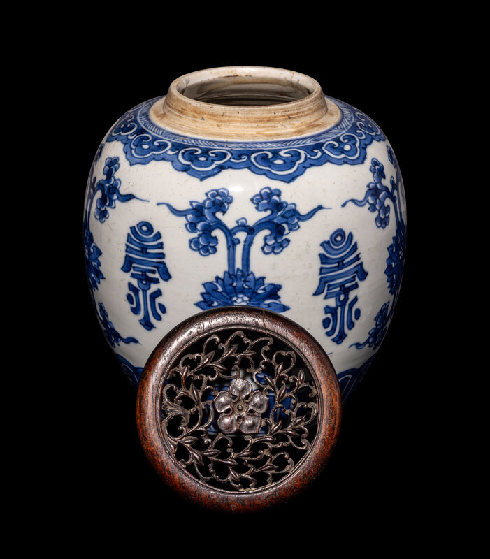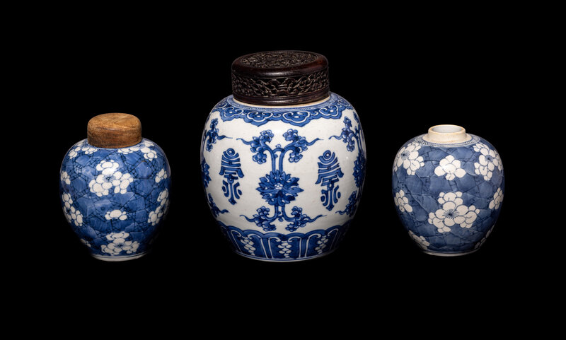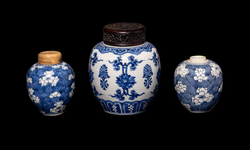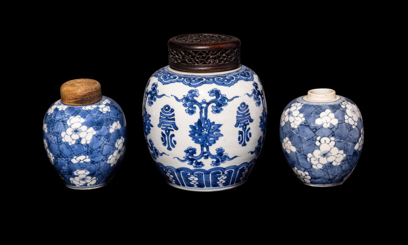comprising a pair of small jars decorated with prunus blossoms on a cracked ice ground, and a larger jar painted with bogu motif with a finely carved wood cover.