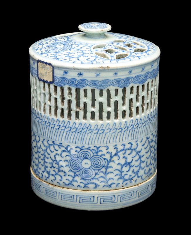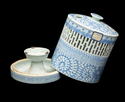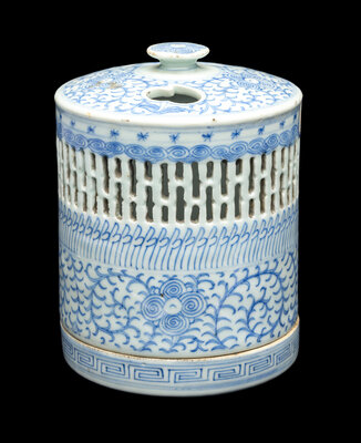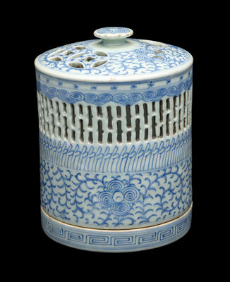 A Chinese Blue and White Reticulated Porcelain Oil Lamp and Cover