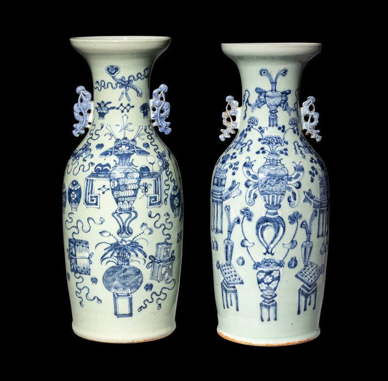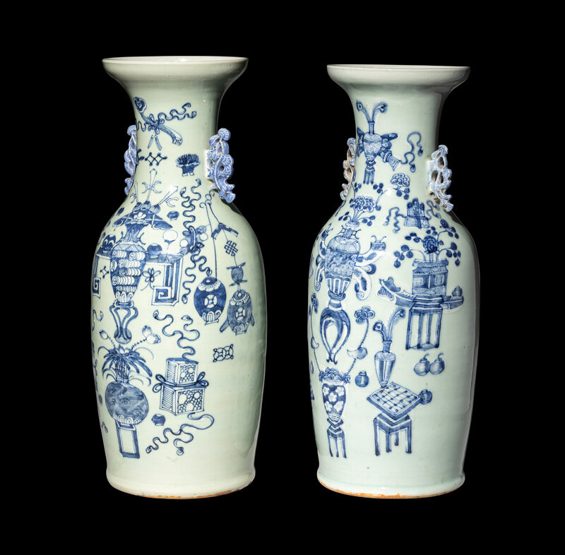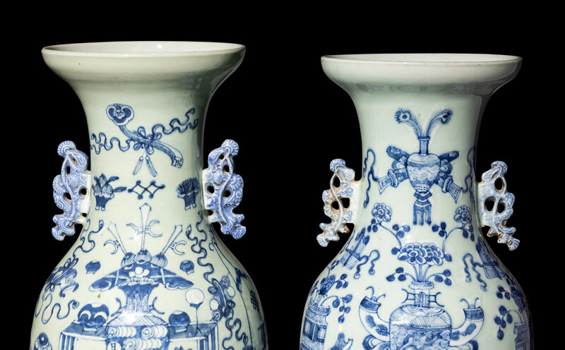 each baluster vase rising to a recessed neck and a dished mouth, painted to the exterior with auspicious objects against a light celadon ground, the neck flanked by a pair of handles in the form of pine tree branches.