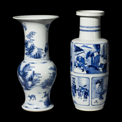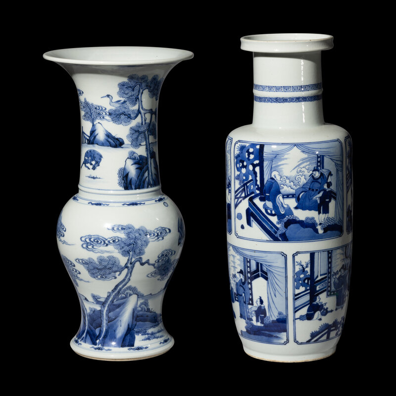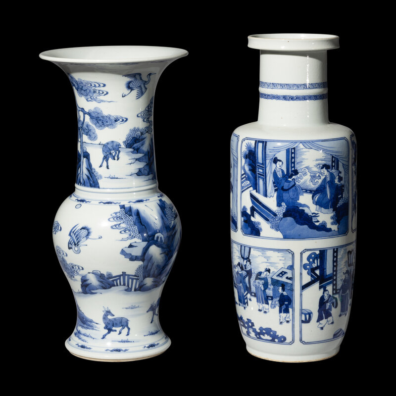 the first a yenyen vase painted overall to the exterior with deer and birds in a rocky landscape, the second a rouleau vase decorated with panels enclosing figures in interior scenes.