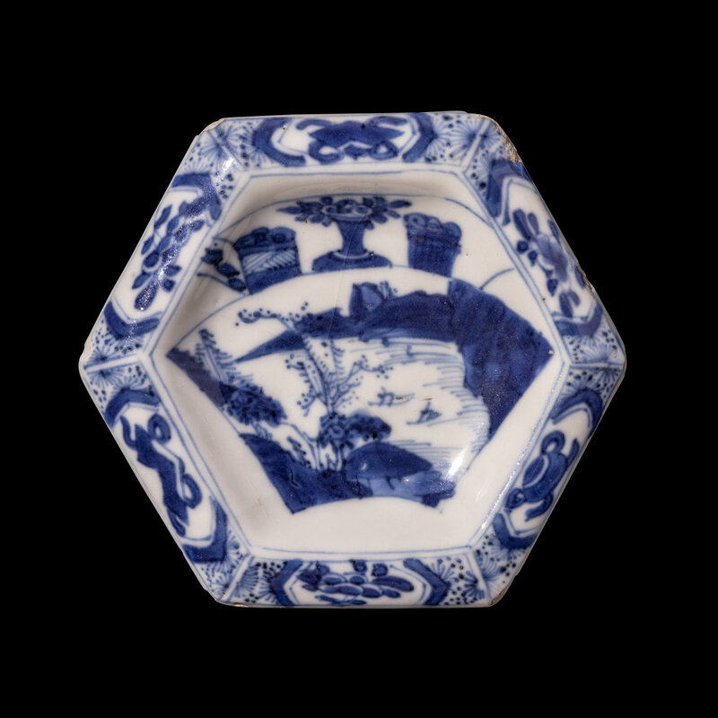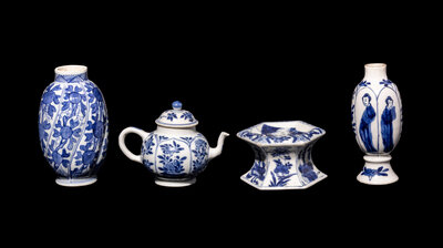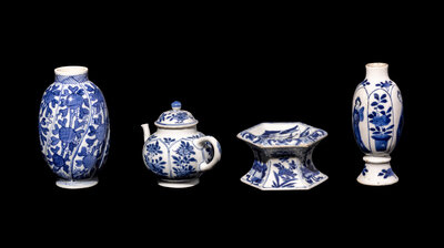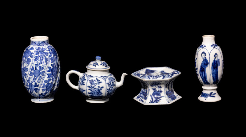 comprising a diminutive teapot, a hexagonal salt jar, and two small vases.
