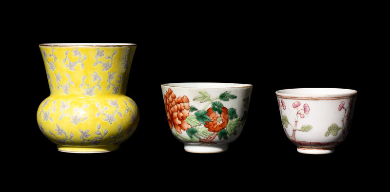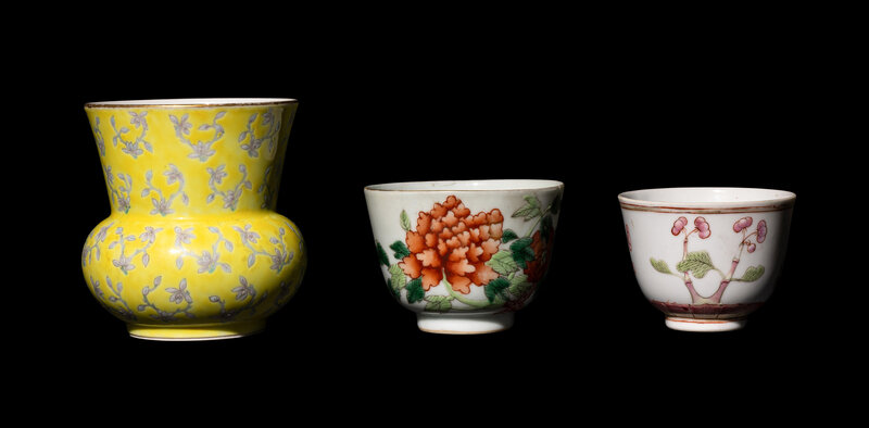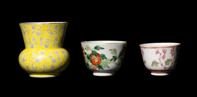 comprising a yellow ground grisaille enameled spittoon painted with floral sprigs, two wine cups each decorated with floral blossoms.