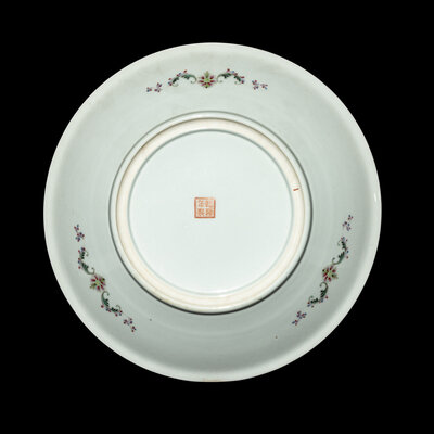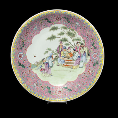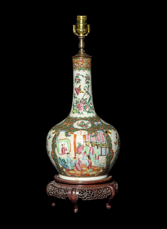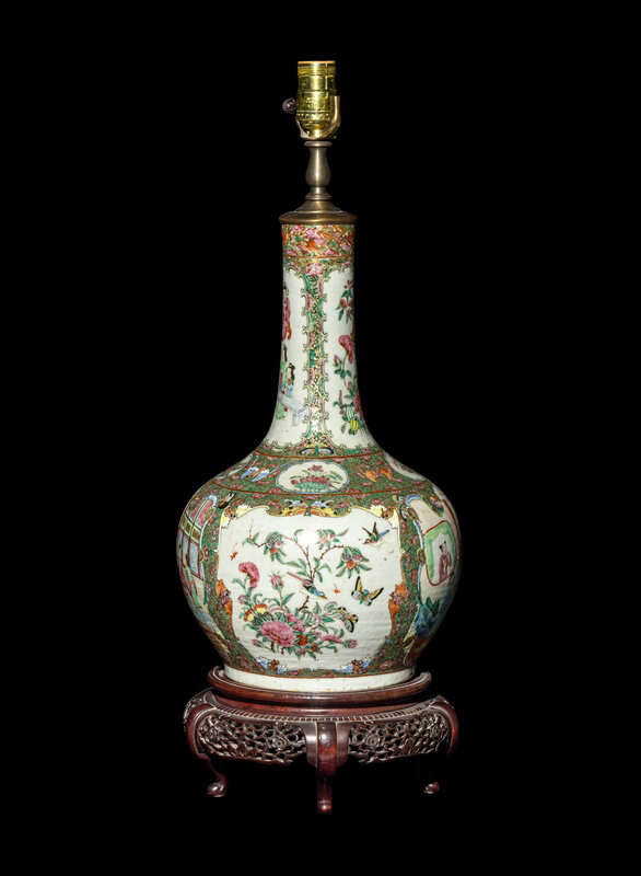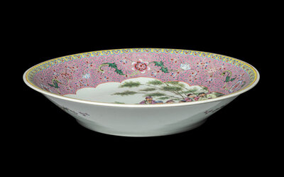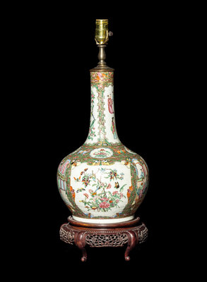 the first a Chinese export rose medallion vase mounted as a lamp, the second a large shallow bowl.
