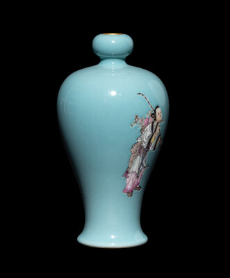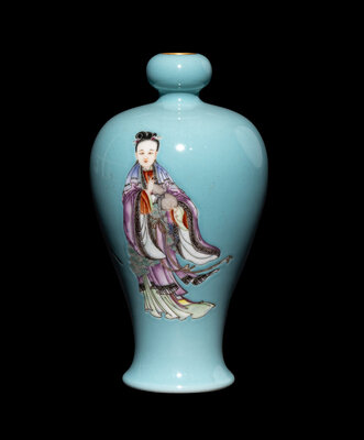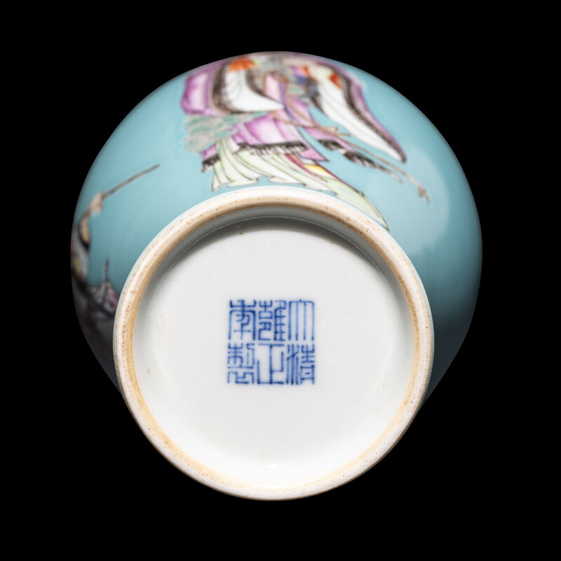 the tapering body surmounted by a garlic-form mouth, the exterior finely painted with a female immortal and her attendant, all reserved on a celeste blue ground, the underside bearing an apocryphal Yongzheng six-character mark in underglaze blue.