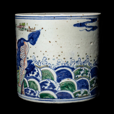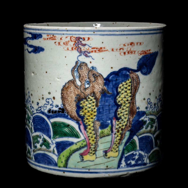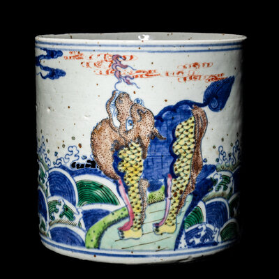 A Chinese Wucai and Underglaze Blue 'Qilin' Porcelain Brushpot, Bitong