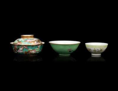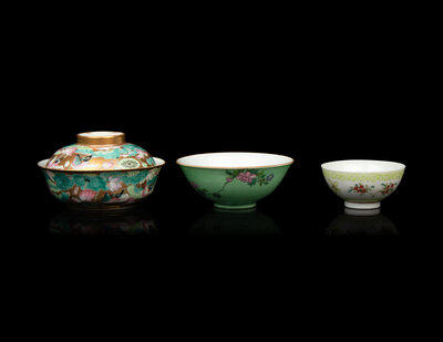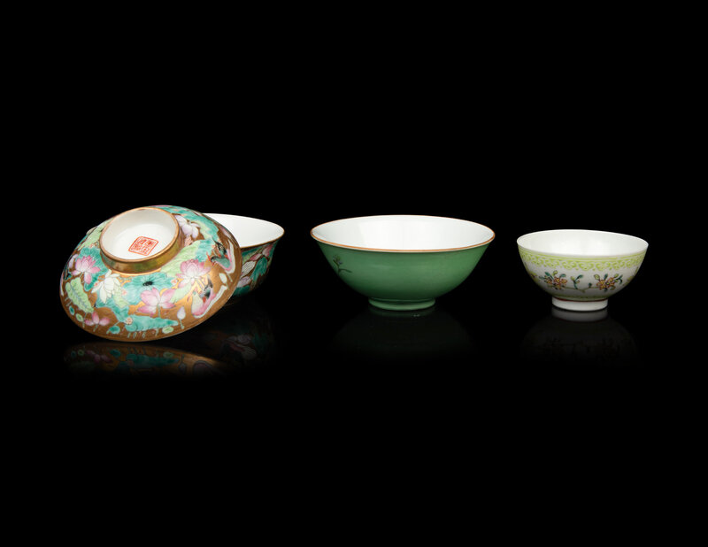 comprising a gilt ground example painted with lotus blossoms, the underside bearing an iron red four-character hall mark; and a lime green ground example decorated with flowering branches; a small example with floral sprigs underneath a band of ruyi heads.