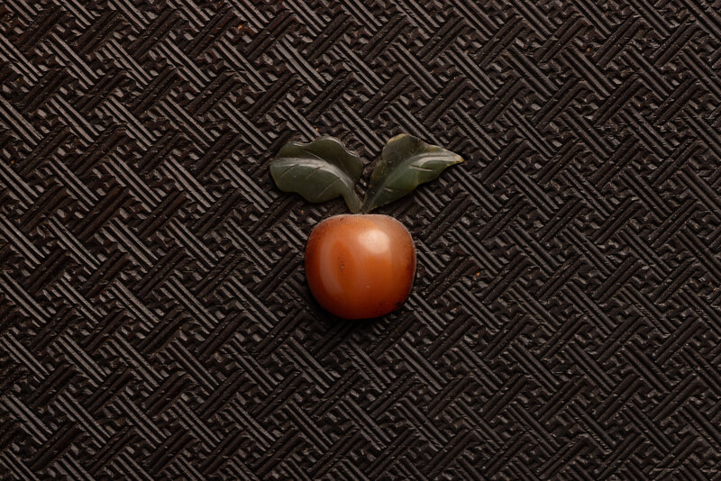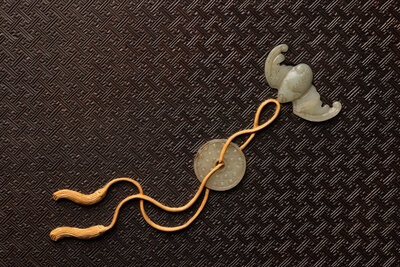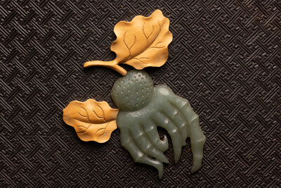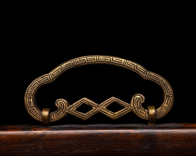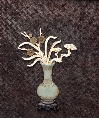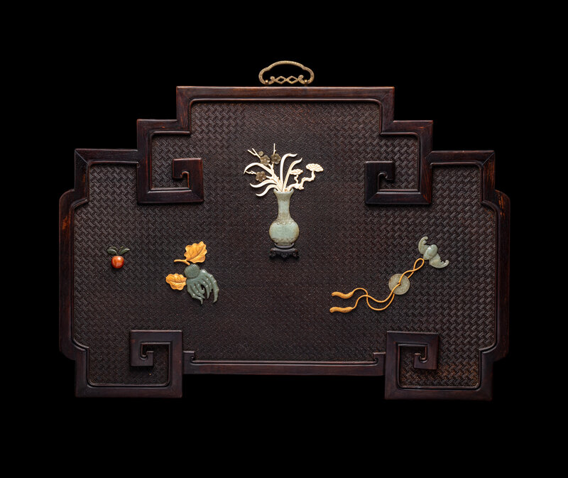 the front of the panel decorated with jade, bone and wood inlays depicting auspicious objects, all set above a carved ground with interlocking T's.