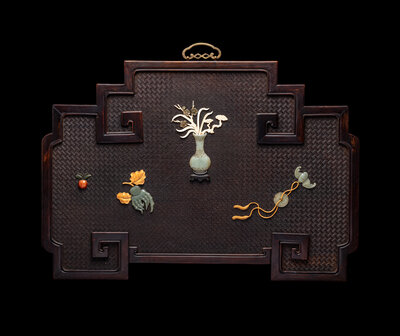 A Chinese Jade and Hardstone Inset Hardwood Wall Panel