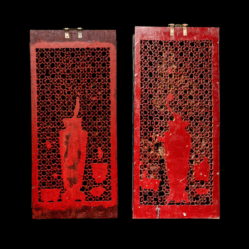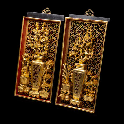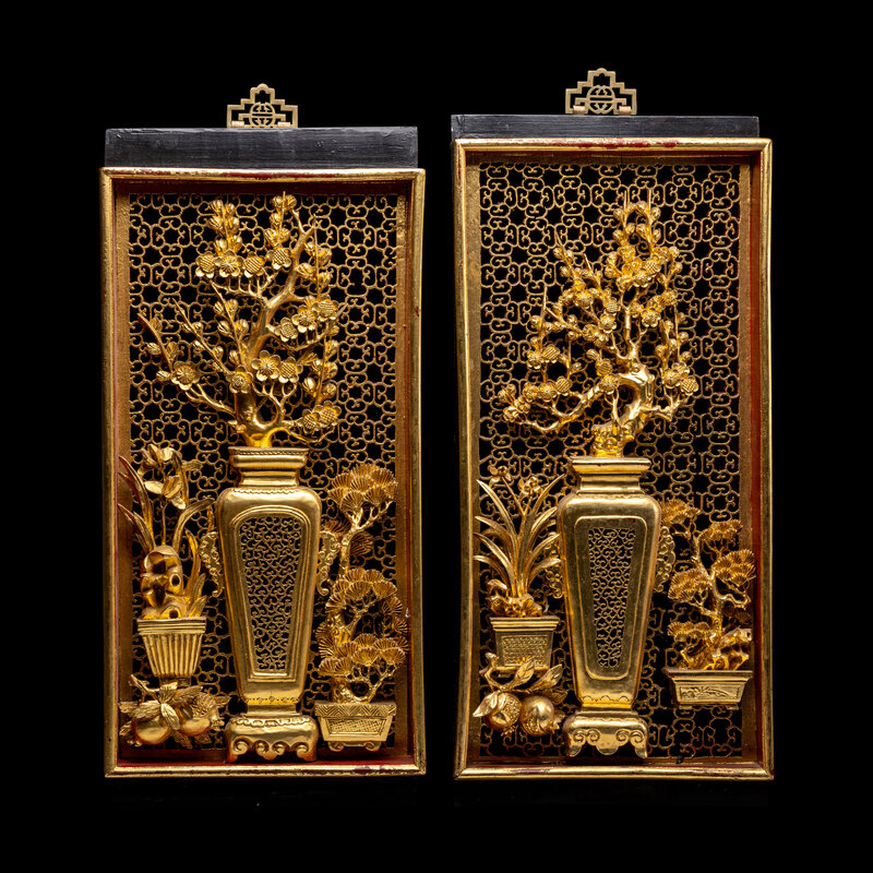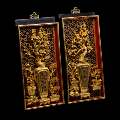 A Matched Pair of Chinese Gilt and Red Lacquered Wood Panels