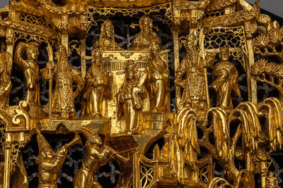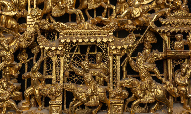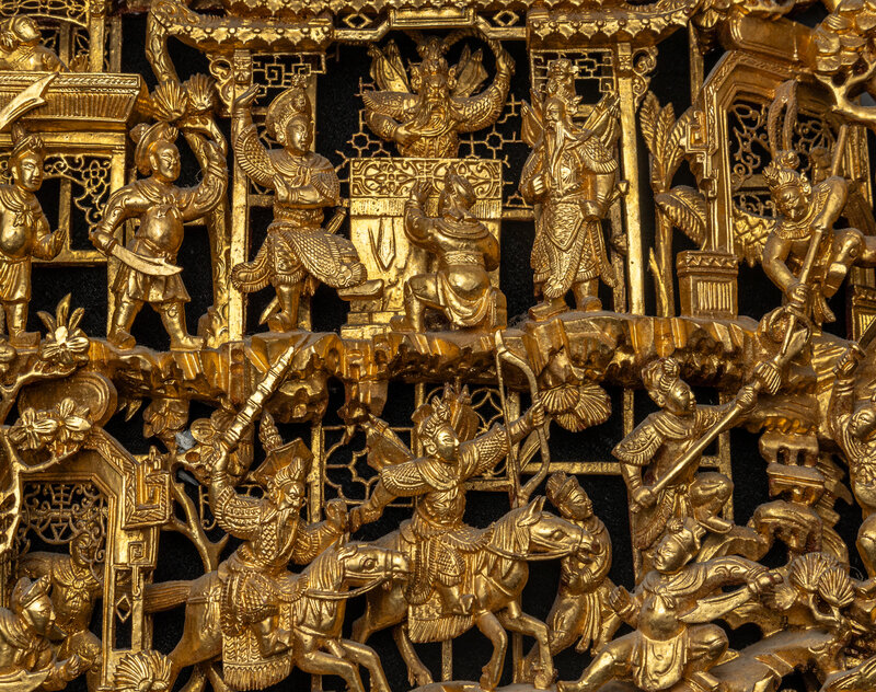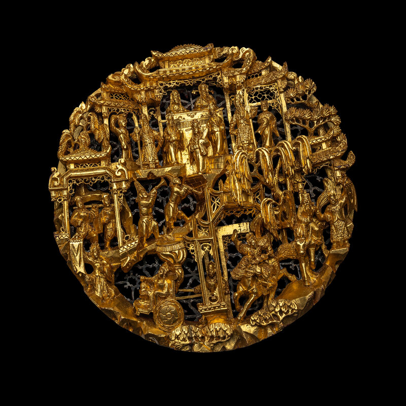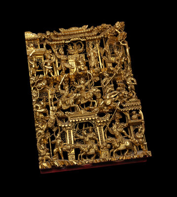 the first a circular example, the second a rectangular example, carved with figures at various tasks.