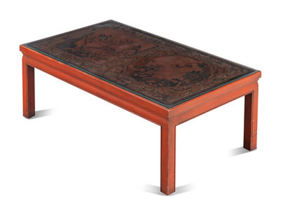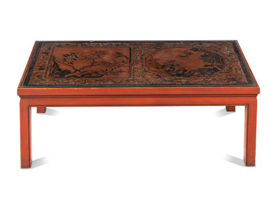 A Chinese Carved and Polychrome Painted Red Lacquered Low Table