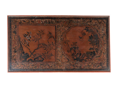 of rectangular section, the top panel decorated with two bird and flowers scenes reserved within square and octagonal borders against a scroll ground.