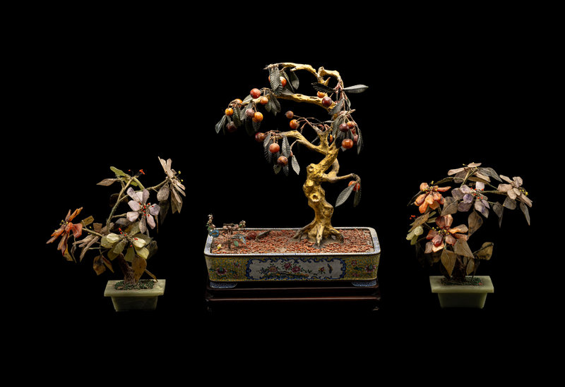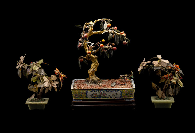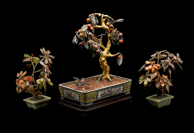 the gilt painted fruiting tree set in a rectangular planter decorated with shaped panels depicting butterflies above floral blossoms, all set above a yellow ground with meandering lotus branches, further raised on a fitted hardwood stand; together with two other small hardstone models of trees in spinach jade planters.