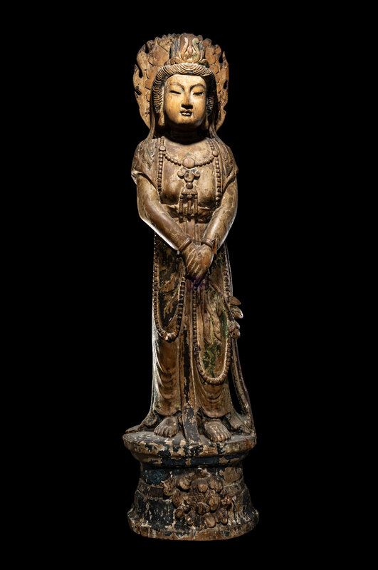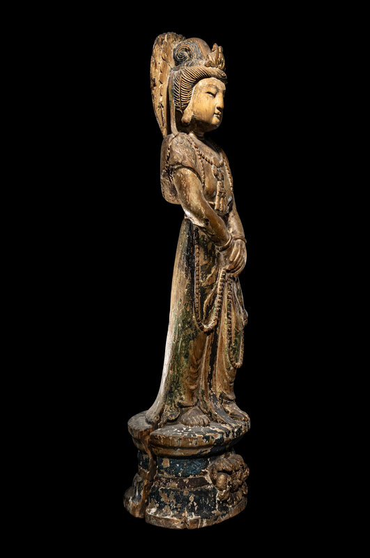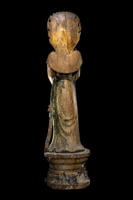 the deity depicted standing on a tall base, dressed in draped robes.