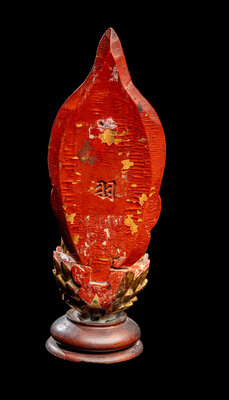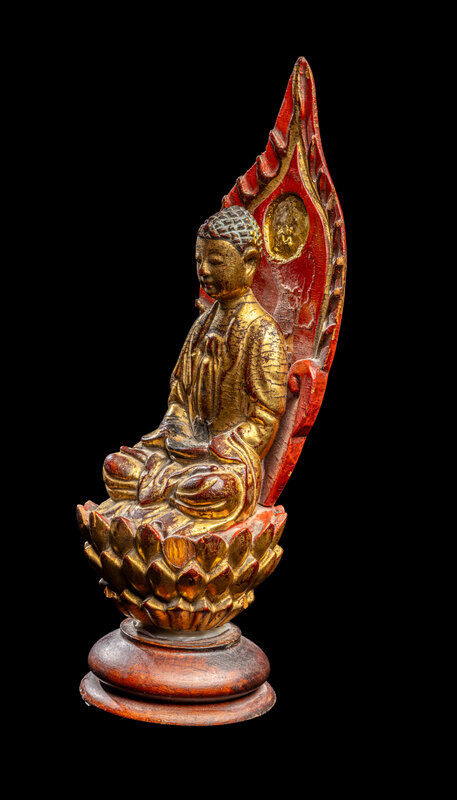 the figure depicted seated in dhyanasana on a lotus base with hands in dhynamudra, backed by a flame-form mandala.