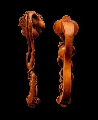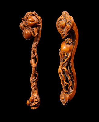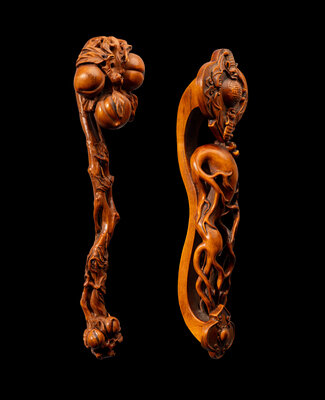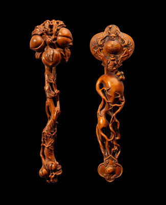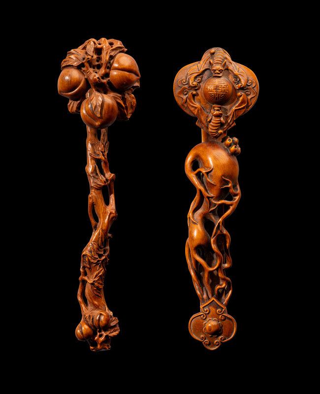 the first carved in the shape a gnarled branch with peaches, the second with the shaft also in the form of a gnarled branch, the larger terminal carved with a pair of bats flanking a shou roundel and the smaller terminal in the shape of a quatrefoil.