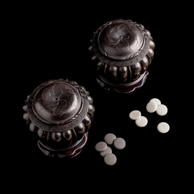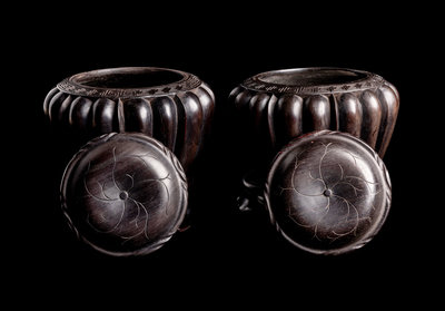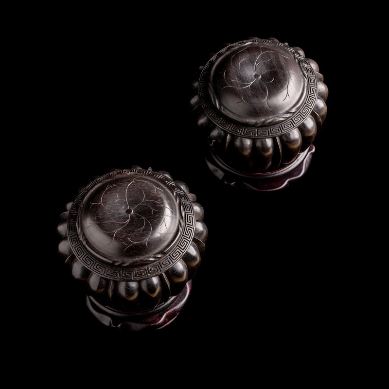 each of bulbous form with rounded lobed walls, the mouth encircled with a keyfret border, and surmounted by petalloid covers encasing game pieces, hardwood stands.