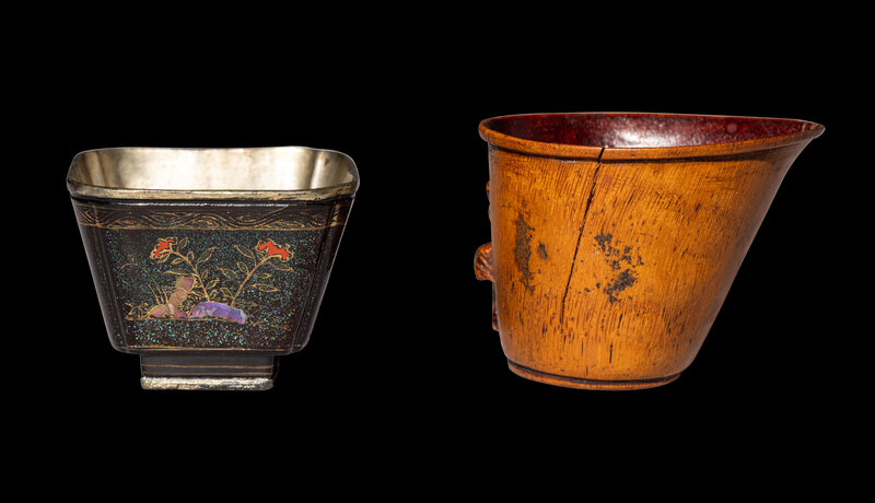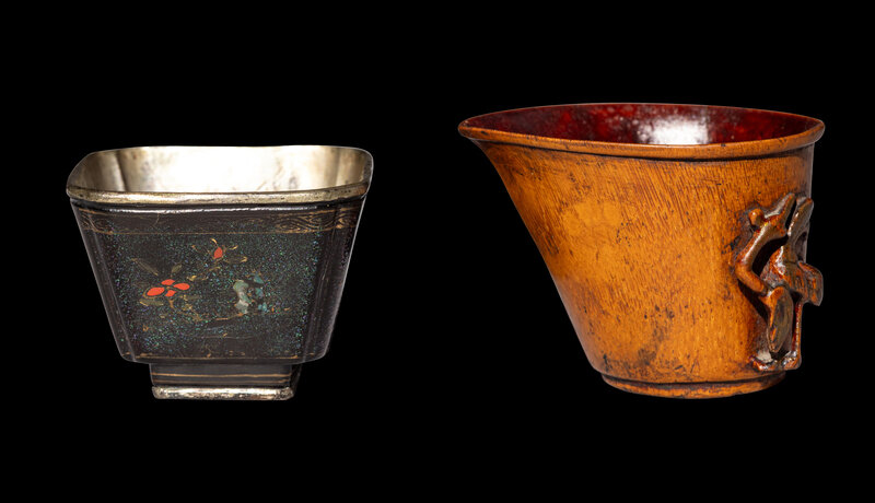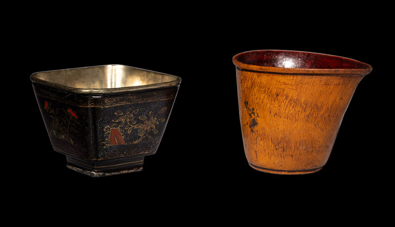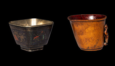 A bamboo cup with a crane carved to exterior, red lacquer to underside, the other silver cup of black lacquer surface with raden inlay.