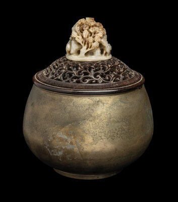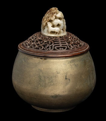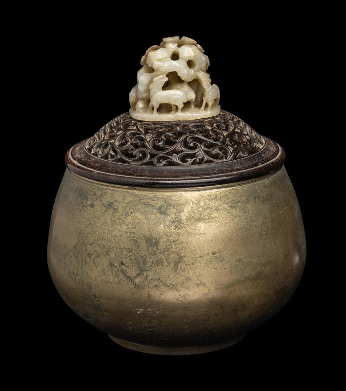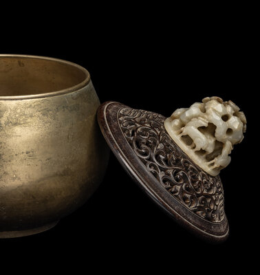 mounted on a reticulated hardwood cover, together with a brass bowl.