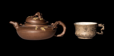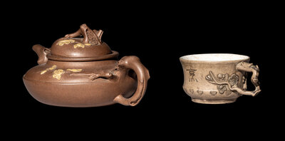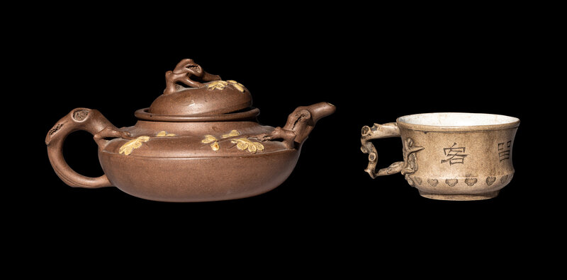 the first a teapot decorated with prunus decoration, the second a teacup with a handle in the shape of a gnarled branch, incised with characters.