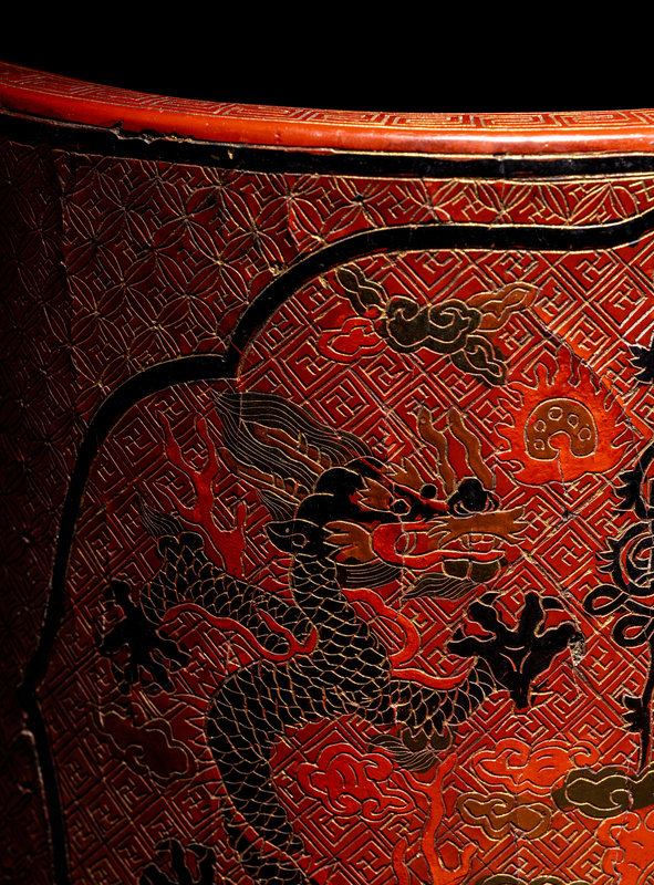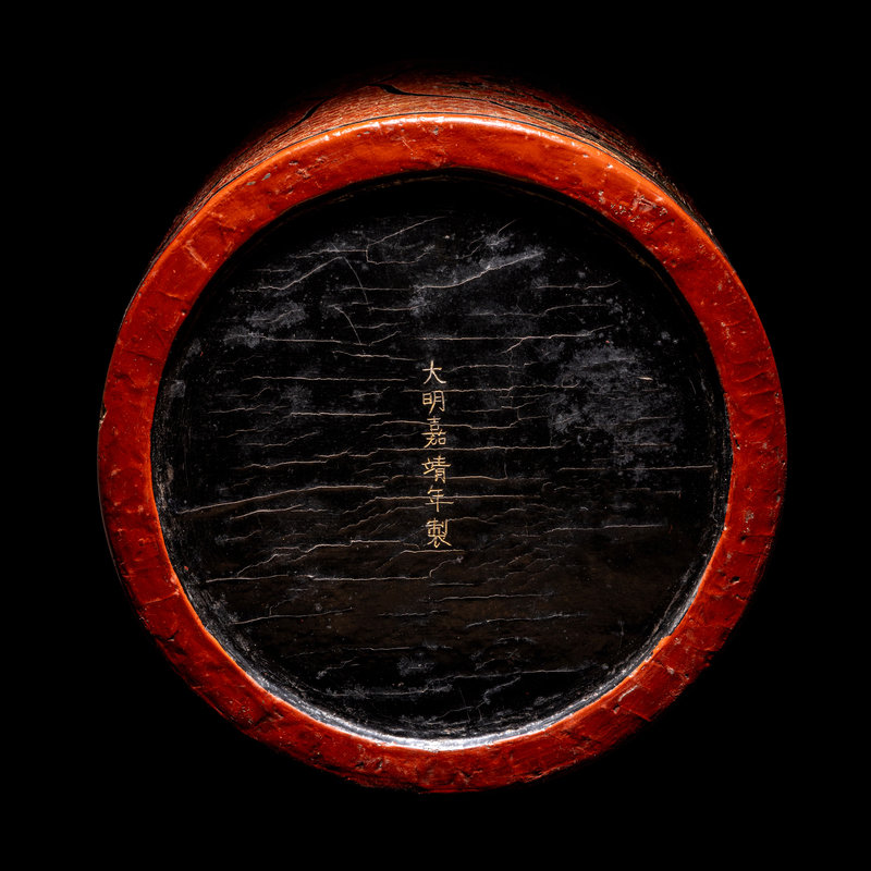of cylindrical form, the exterior finely incised and painted with three shaped cartouches enclosed paired dragons, the underside inscribed in gilt with an apocryphal six-character Jiajing mark.