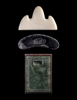 comprising a white marble brush rest, a bronze brush rest, and a jade inkstone.