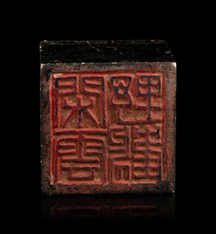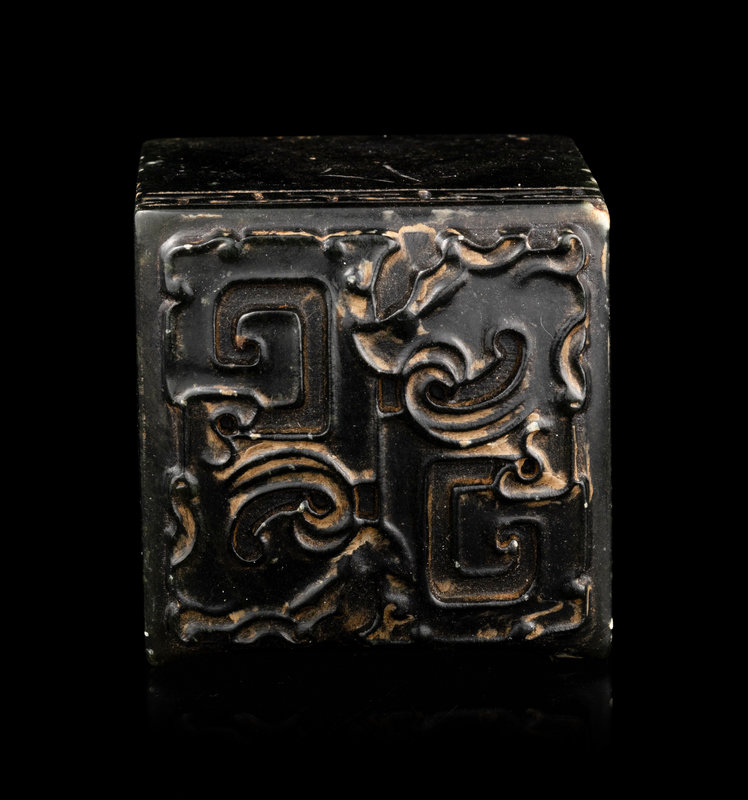 carved of square form, the four sides softly polished beneath a narrow compressed border, the top slightly carved in relief to its soft concave withst stylized archaistic forms.