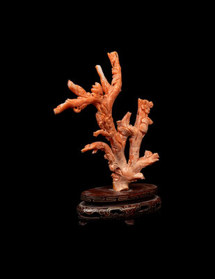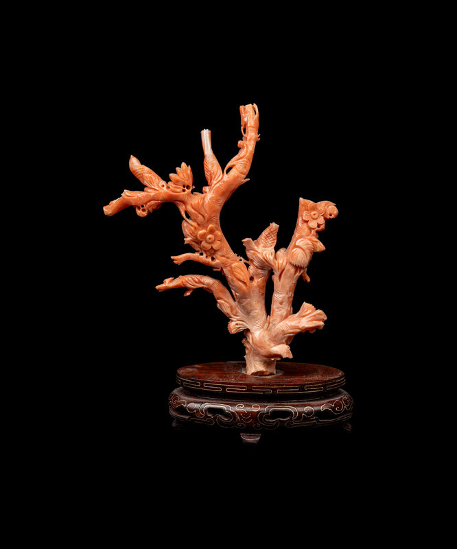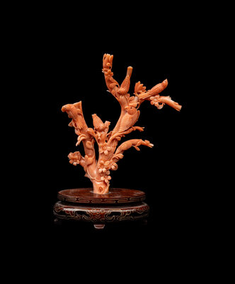 carved as cherry blossoms, supported by an oval-shaped wood stand.