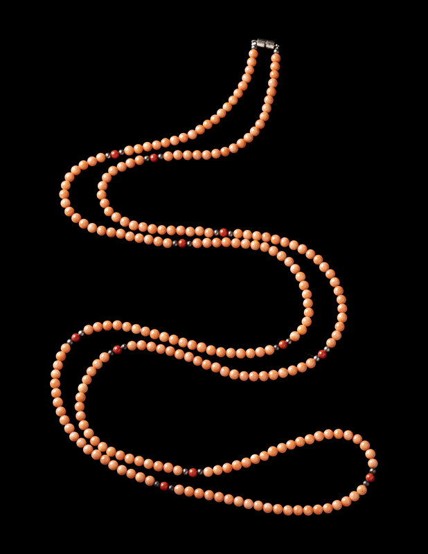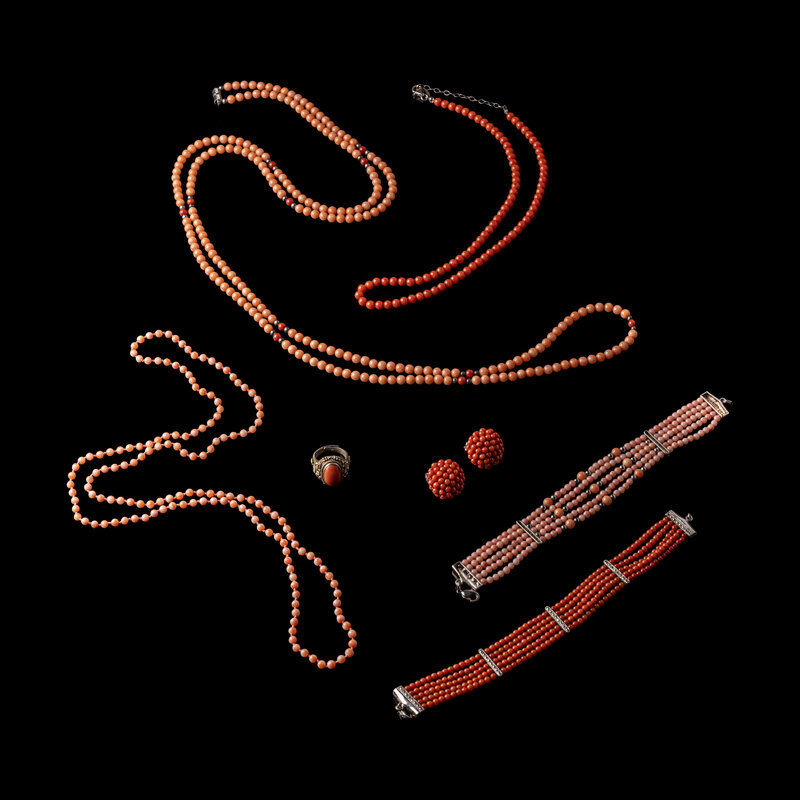 comprising three necklaces, two bracelets a pair of ear clips and a ring.