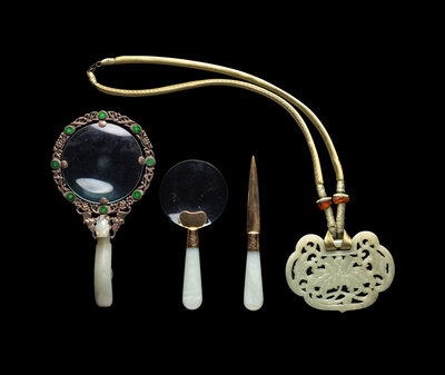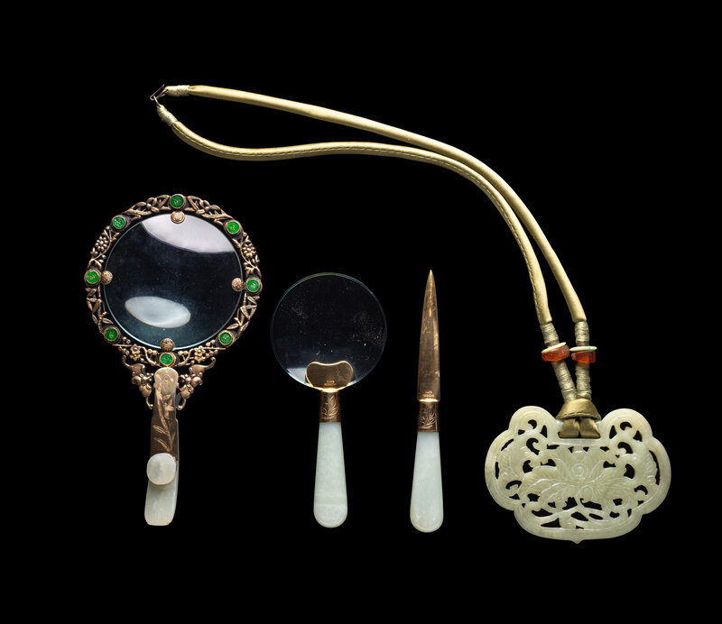 comprising a celadon jade, green hardstone and silvered metal mounted magnifying glass, a set of a jadeite mounted magnifying glass and a jadeite mounted gilt metal knife, and a celadon jade ruyi lock-form pendant.