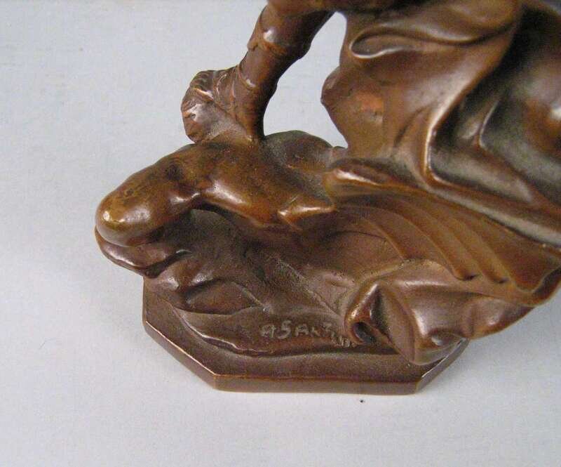 Bronze, medium brown patina, depicted with his sword unsheathed and raised, his foot on the head of a demon, indistinctly signed, 'ASANT.....' to base.