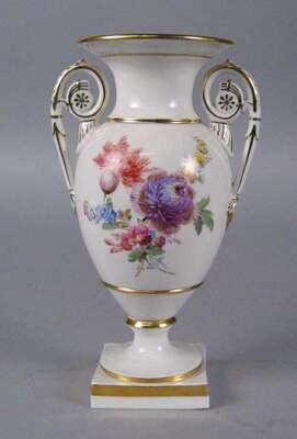 Of campana form, the white body decorated with gilt and foliate bouquets, the spreading foot on a square base.