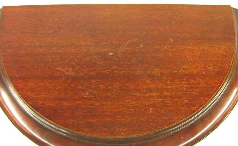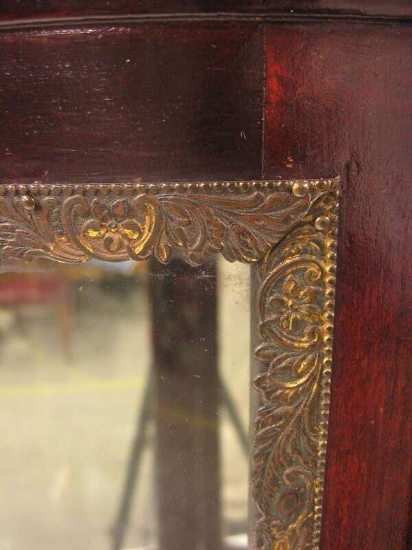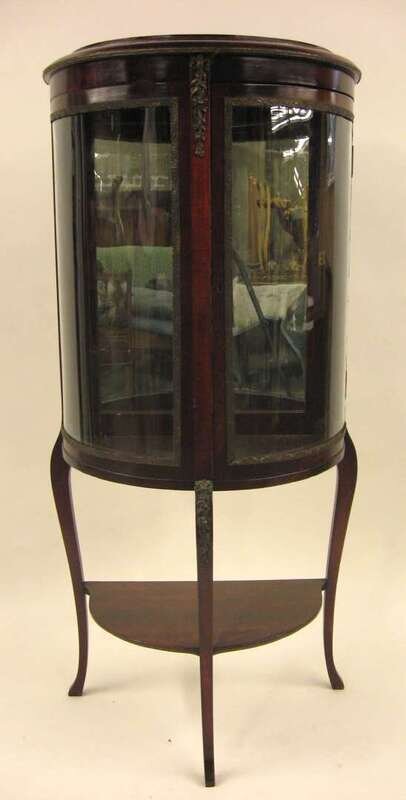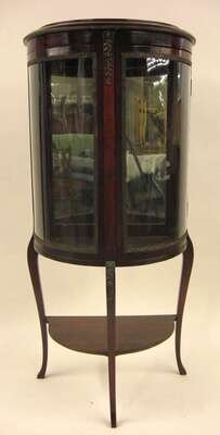 The D-shaped top above a pair of bowed glazed cupboard doors opening to an interior with a mirrored back raised on cabriole legs joined by a platform stretcher.