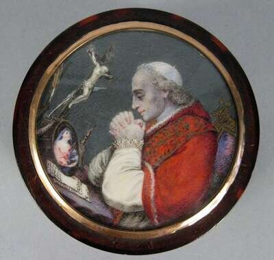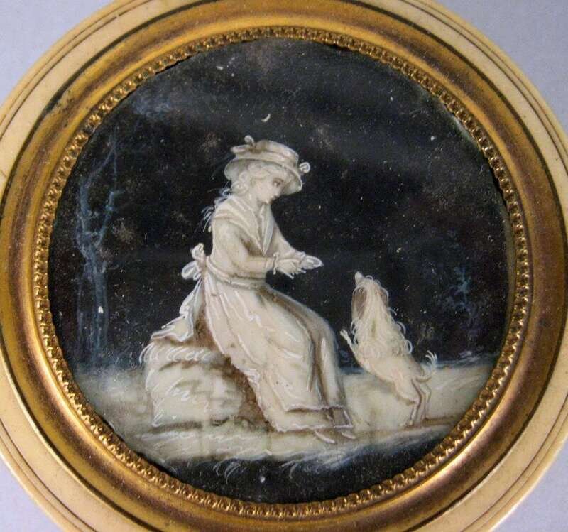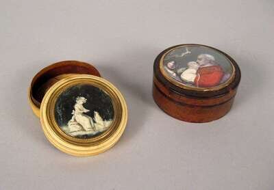 The larger example of burlwood and tortoiseshell, the cover depicting a bishop at prayer; the smaller example of ivory the cover with a grisaille depiction of a young lady and dog. (2).