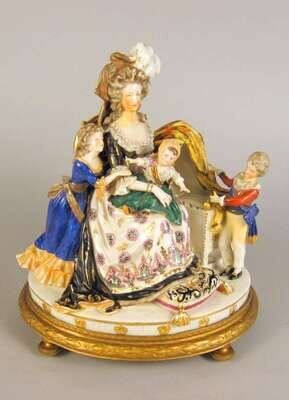 Modeled as a seated woman with three children, raised on a gilt metal base with bun feet, rear of base with crown and N mark.