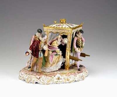 Modeled as an elegantly dressed Elizabethan lady stepping into a gilt decorated sedan chair attended by a suitor, a pair of livery men standing by, on a molded rococo base, underglaze blue crowned mark to underside.