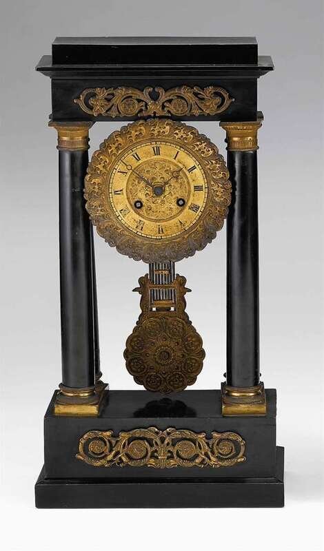 The circular dial with Roman numerals surmounted by a stepped pediment and surrounded by Doric columns, raised on a stepped square base, with elaborate cast pendulum cast as a flower head.
