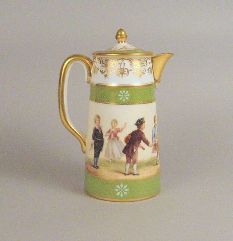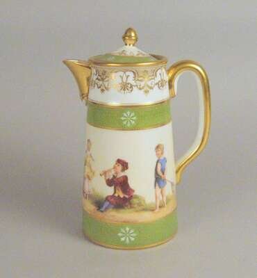 Of tapered cylinder form decorated with a continuous scene of children at play between light green bands with gilt highlights, with a gilt loop handle, finial and spout.